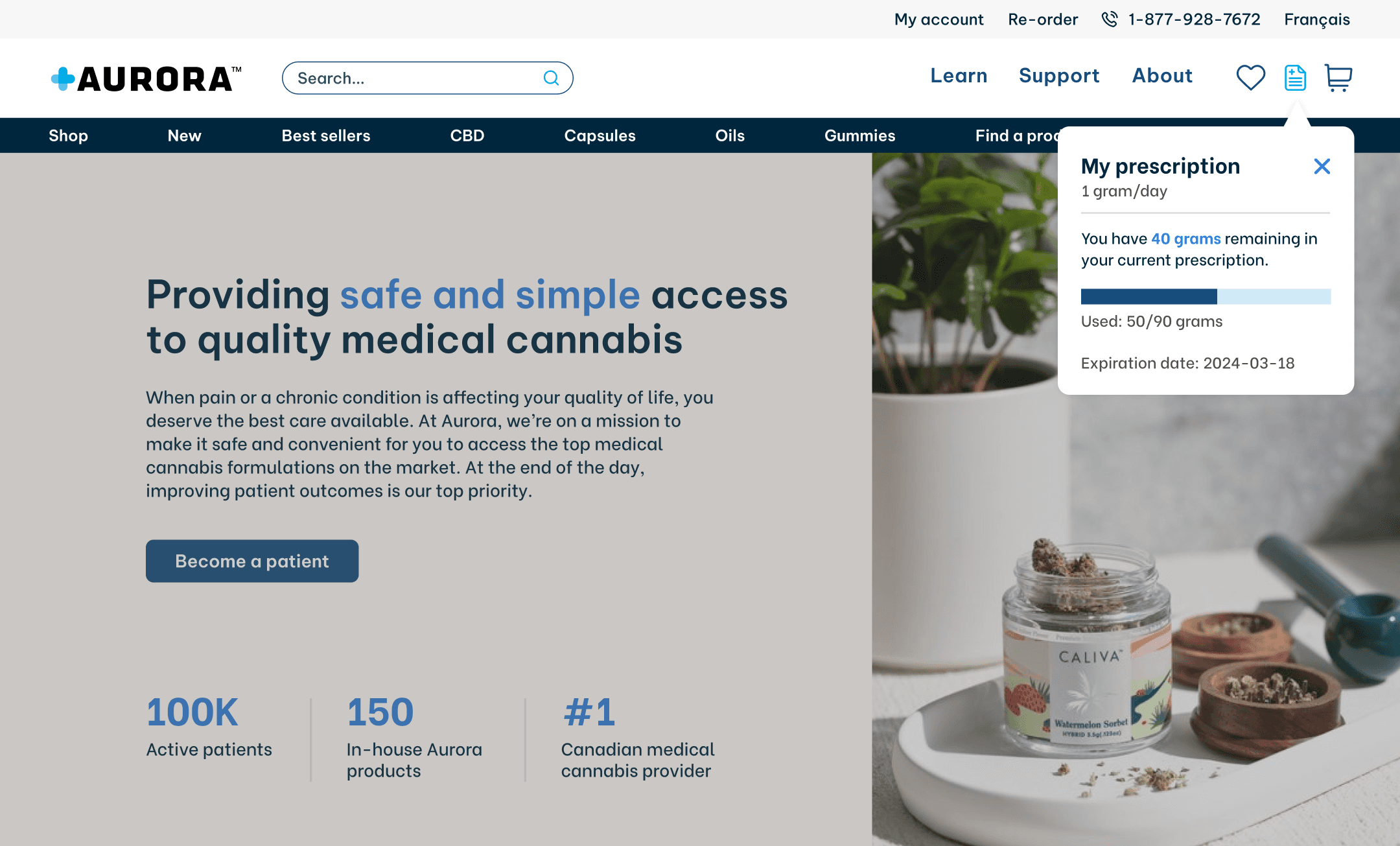 Aurora Medical’s eCommerce platform serves medical cannabis patients, including two primary personas: civilians and veterans. Veterans, whose prescriptions are covered by VAC, require more detailed information than civilians to manage their benefits, while civilians still need clear prescription tracking to stay within gram limits. Many patients are over 50 and less tech-savvy, making clarity and accessibility essential.